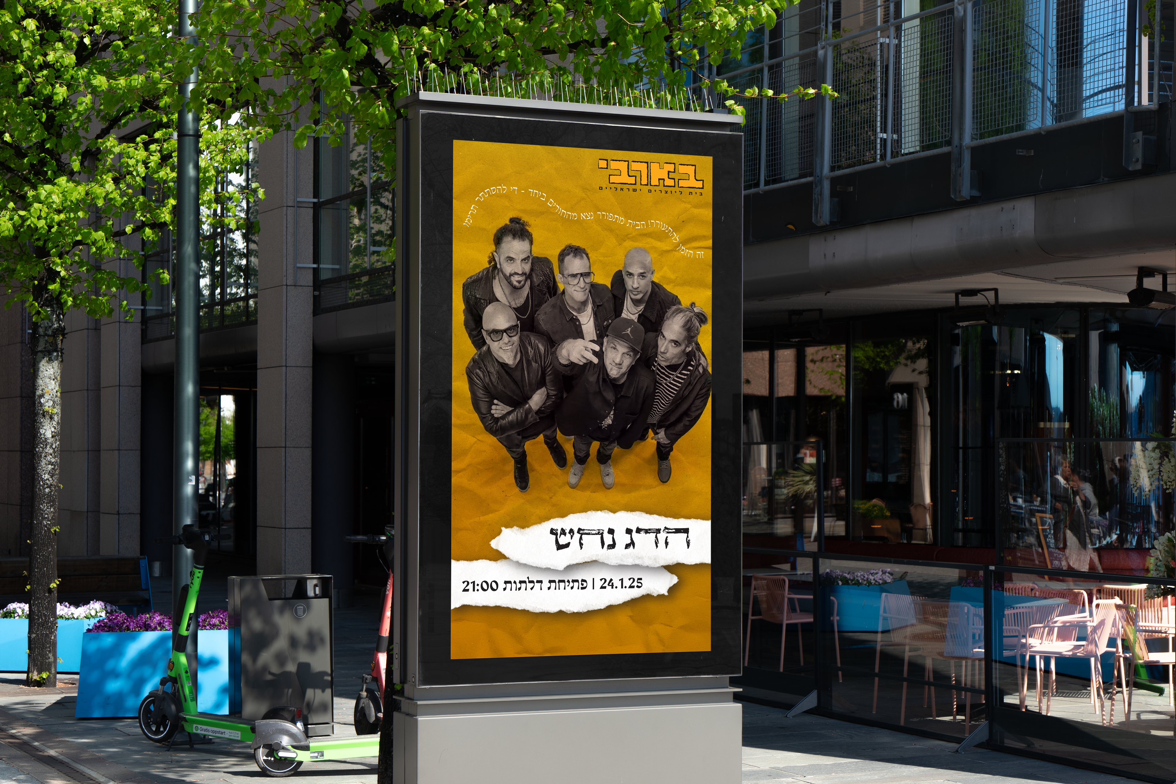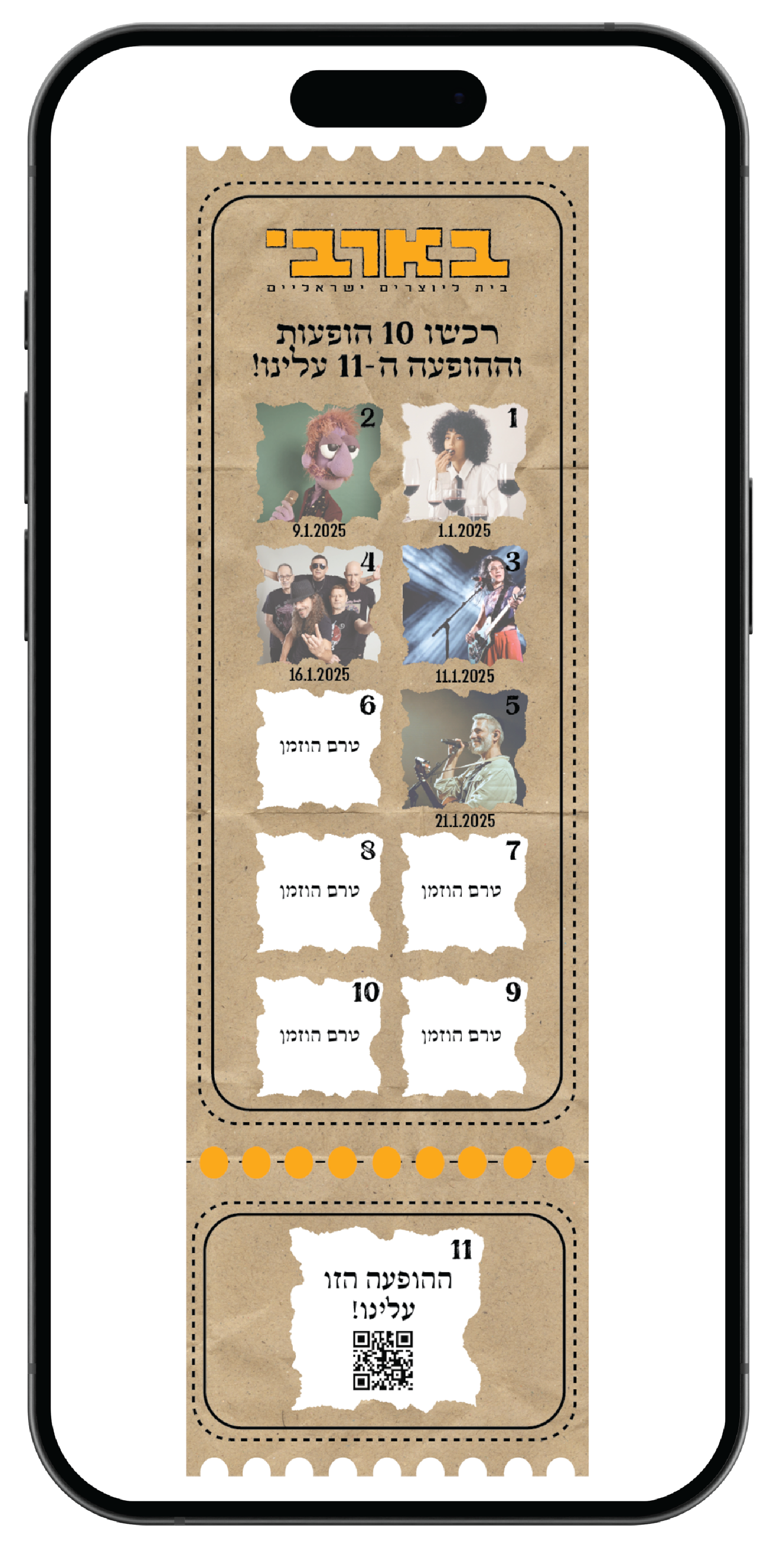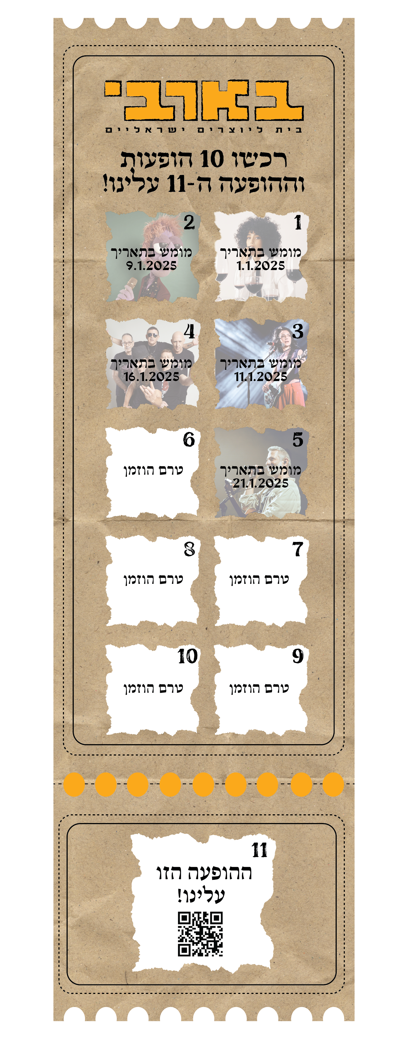 I designed in a vintage style with a modern touch, conveying the authenticity of "the home of Israeli music" The visuals incorporate aged textures, paper scraps, and quotes from the artists' songs to evoke a sense of nostalgia. The white, yellow, and black hues complement the logo and blend with warm, worn-out backgrounds. The gift cards are inspired by vintage tickets, with unevenly cut edges and weathered textures, enhancing the timeless feel.